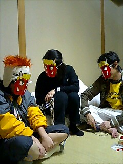 さて、2月3日は”節分”です。 運を招き入れようと豆まきを企画した3人娘+餅つき王子、なぜか4人とも鬼の面を被ってる・・・。 変な光景〜。 そんなことは気にしない4人の鬼達は 『鬼は〜外!福は〜内!』 と館内中に聞こえるんじゃないかと思うくらいの大声を上げて部屋中に豆をばらまきました。 |